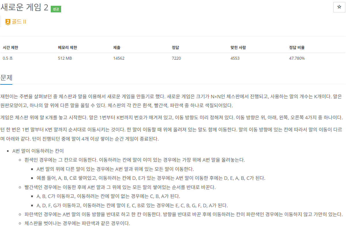 나는 2차원 stack 공간 pieceOnBoard + 2차원 색을 저장할 체스판 board + 각각의 체스말의 위치 저장 리스트 pieces를 사용해서 풀었다.