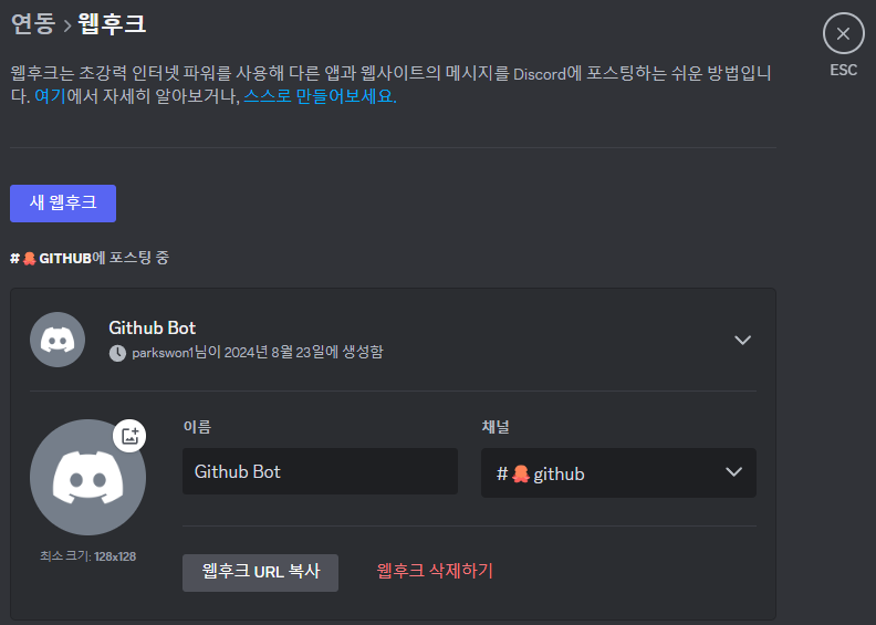 그후 웹후크 URL을 복사해서 사용하면 된다. 이제 github 리파지토리로 가보자
