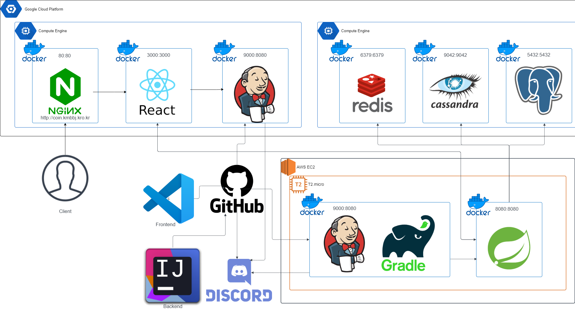 사실처음에는 aws ec2 프리티어만 사용해서 모든걸 올리려고 시도했었다. 하지만 프리테어에서 제공되는 ram은 1GB, 정상적으로 작동되는 서비스에서 늘릴수있는 가상ram 2GB를 합쳐도 카산드라 혼자먹는 2.7GB의 ram을 감당할수 없기 때문에 gcp로 분리를 하기로 했다. 이번프로젝트에서 느낀 aws과 gcp의 차이가 있다.