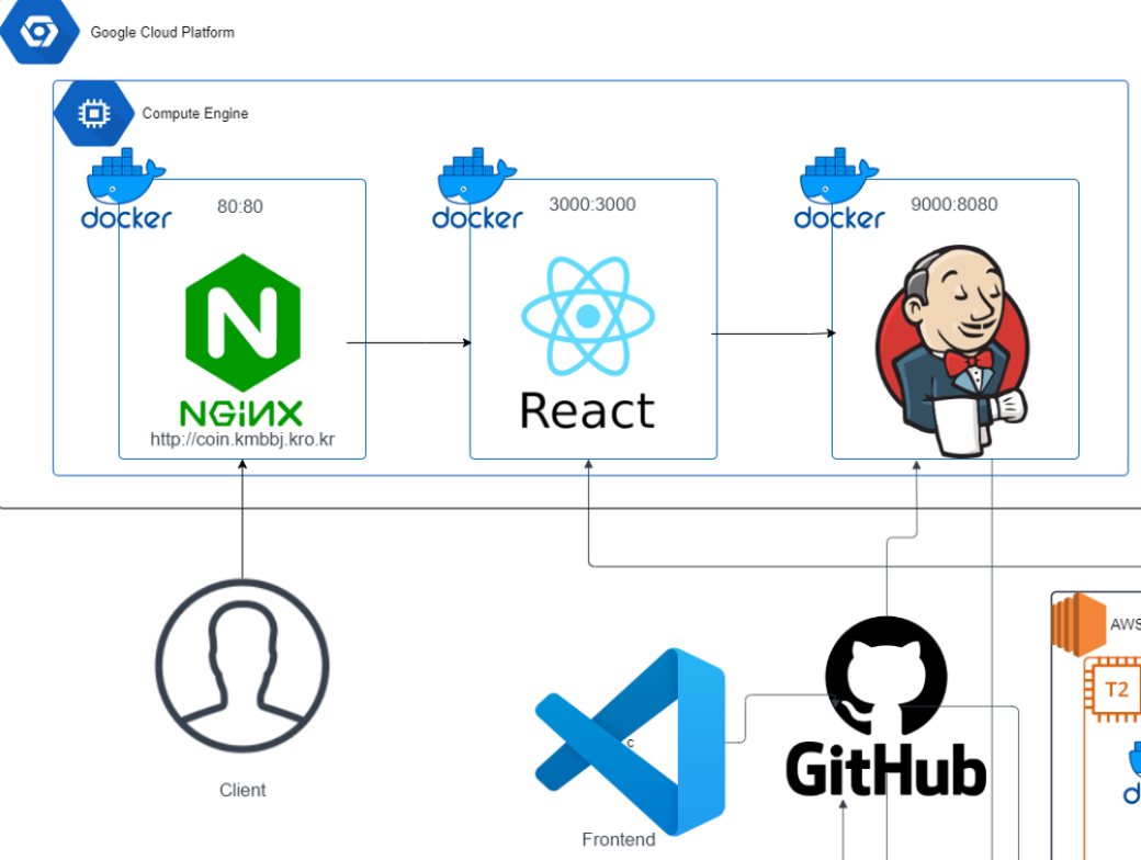 React는 GCP위의 Docker컨테이너 위에서 실행되며 3000 port로 사용자에게 배포된다.
