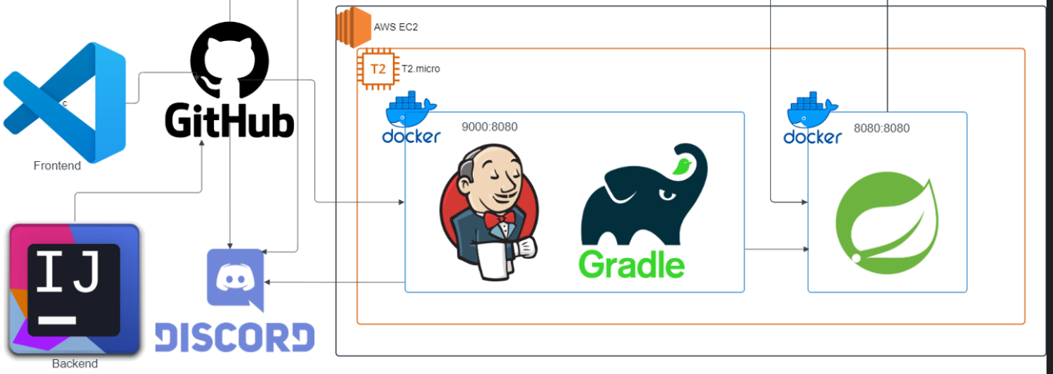 github의 main branch가 변경될 경우 CI/CD를 9000포트로 보내서 젠킨스가 gradle로 빌드를 하고 spring컨테이너를 만들어서 spring을 배포하게 된다. 프론트엔드의 경우는 react를 배포하게 된다.
