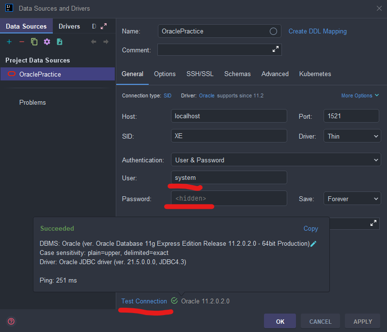 빨간 줄이 그어진 부분을 입력하고 test connection을 누르면 된다.