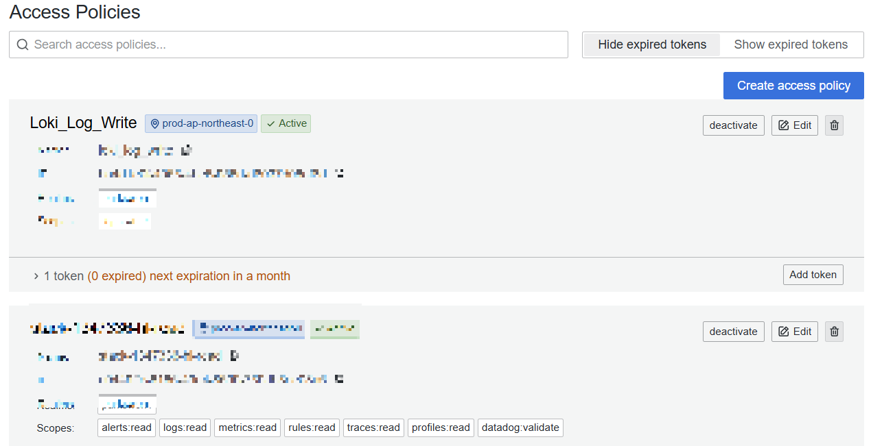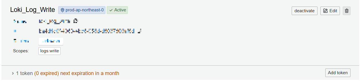 지금 필자는 promtail로 log를 보내는 연습만 할것이기 때문에 logs -> write 권한만 넣어준 채로 생성하겠다. Realms은 stack이 하나만 있을테니 자신의 아이디를 고르면 된다.