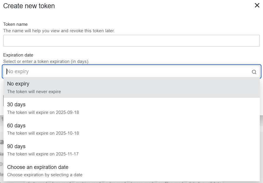 토큰 이름을 자신이 식별하기 쉬운 이름으로 작성한 뒤, Expiration date를 정해준다. 웬만하면 완료되도록 만들고 달력에 만료되는 날짜를 적어두자! (여러 사이트에서 생성된 토큰들을 모아두고 만료일자를 알려주는 솔루션을 개발하는 것도 재미있을 듯!)