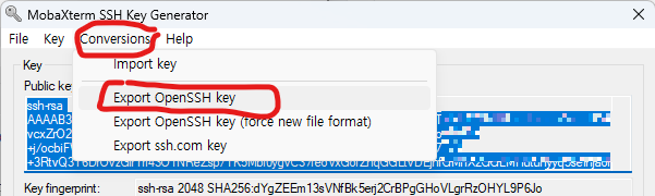 위에있는 Conversions를 누르고 Export OpenSSH key를 눌러서 private key를 .pem방식으로 생성하자