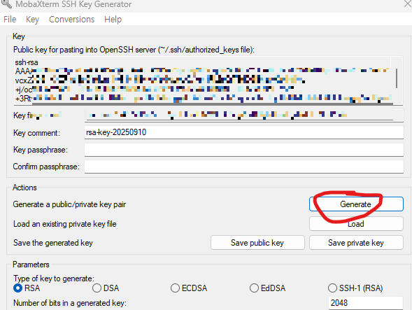 Generate를 누르고 지금 ssh-rsa가 있는 부분에 마우스를 마구마구 흔들면 키가 생성된다.여기서