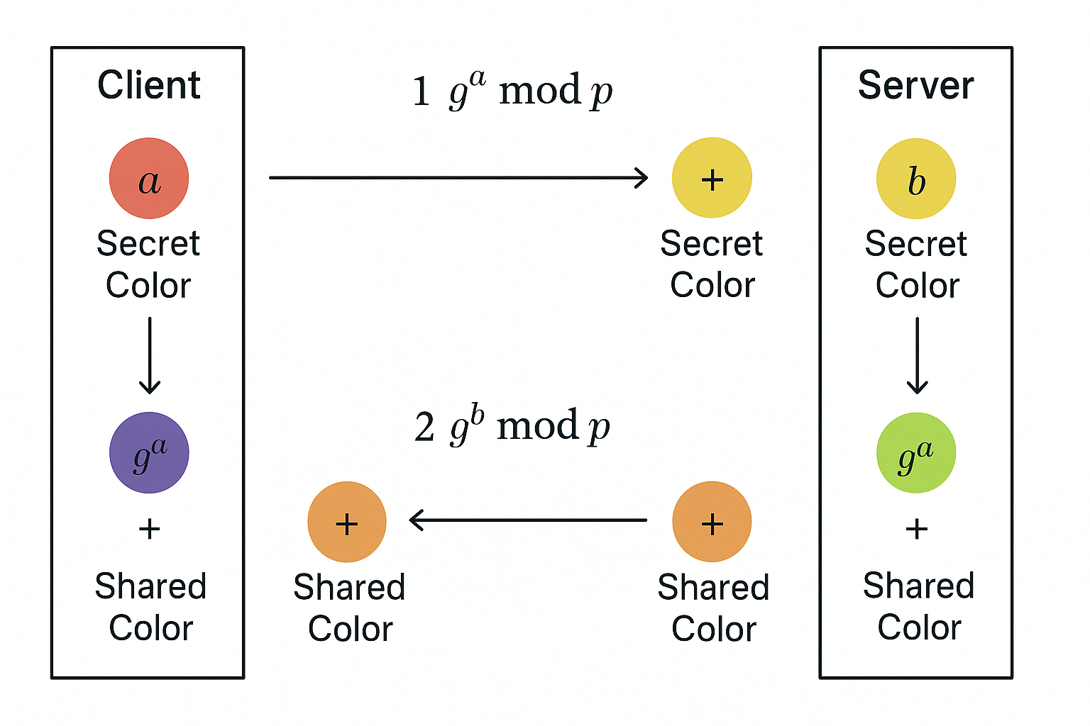 클라이언트: (gb)amod p=gabmod p(g^b)^a \mod p = g^{ab} \mod p서버: (ga)bmod p=gabmod p(g^a)^b \mod p = g^{ab} \mod p