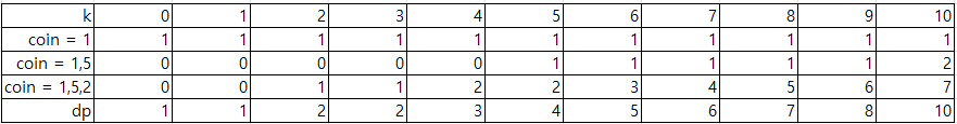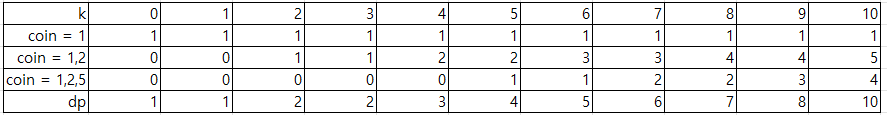 좀더 보기 쉽게 정리했다. 아래표는 k를 만들수있는 coin의 가짓수를 모아놨다. coin = 1은 1만을 사용해서 만드는 가짓수이고 1,2는 1과 2둘다 사용, 1,2,5는 3개를 전부다 사용한 가짓수이다. 이런식으로 모으는 이유는 중복을 피하기 위해서이다.