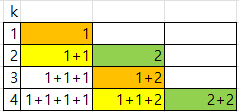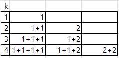 위 사진은 가치의 합이 k일때 가짓수를 다 적어놨다. 1일땐 1한개 2일땐 1+1,2 두개인 식이다. 여기서 규칙을 찾아낼 수 있는 데