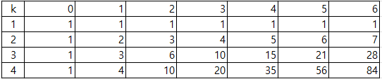 다음은 문제 예제 입력 2로나와있는 N = 6 K = 4일경우의 가짓수를 모두 표로 나타냈다. 본표는 0부터 6을 정수 k개를 사용할대 만들수 있는 가짓수이다. 왜 이런 결과값이 나타나는지 확인해보자.