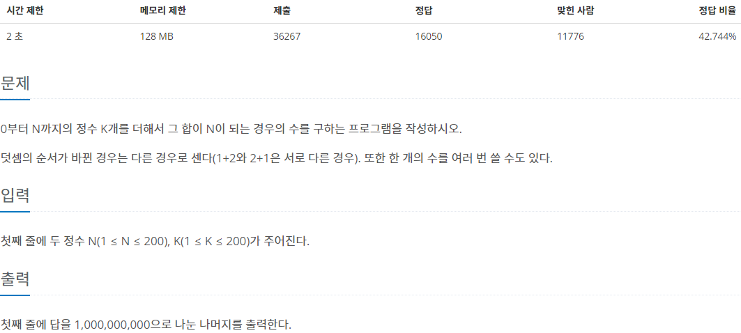 이문제는 이런 결과를 저장해 나가는 방식으로 하면된다. 0부터 N까지의 정수를 1부터 k개를 더해서 나오는 경우의 수를 다 저장하면된다. 그후 배열의 가장 뒤에있는 숫자를 출력해주면 된다. 자세한것은 예시를 들어서 설명하겠다.