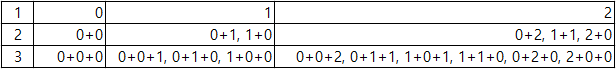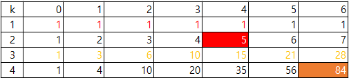 이번 표는 가짓수를 모두 적어놨다. 여가서 규칙을 찾아볼수 있는데 0을 만드는 가짓수는 항상 1이다. 2을 만드는 k개수의 가짓수는 k-1개수의 0+1+2드르이 가짓수를 모두 더한 값이다. 표를 보면 앞에있는 비슷한 숫자로 가짓수가 다시 생기는 걸 볼수 있다. 만약 정수 n을 k개 더해서 만드는 경우의 수는 k-1개 더해서 만드는 0~n까지의 가짓수를 다 더해주면된다.