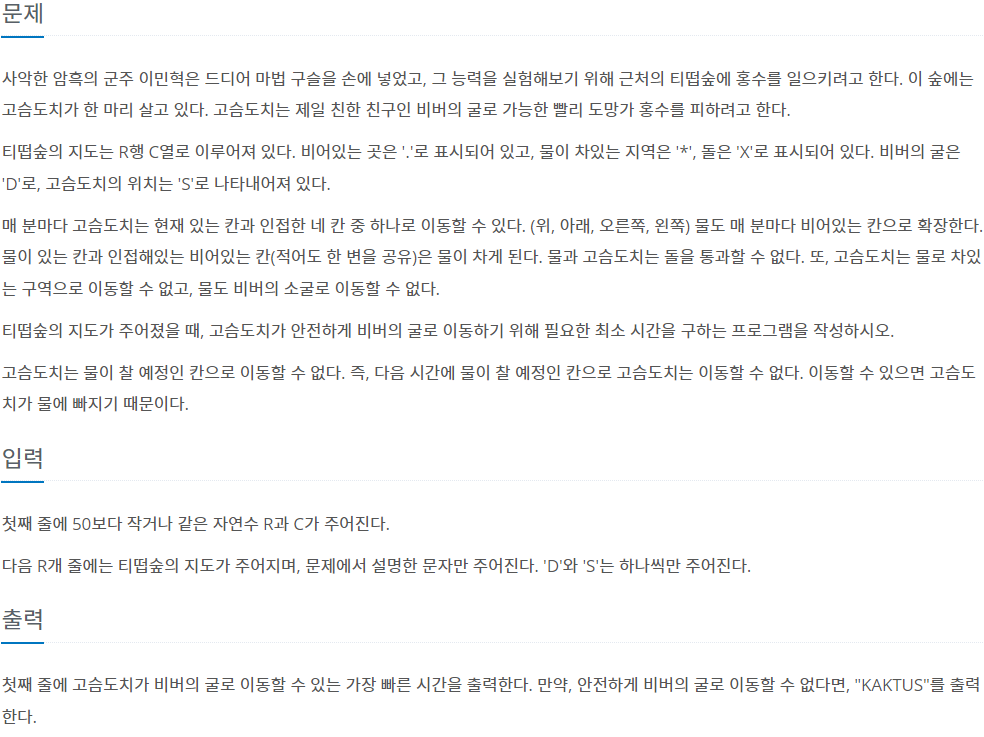 def bfs(S,water,count): //bfs를 수행할 함수 호출 고슴도치가 간 곳들을 저장할 배열 S와 물이 차오르는 곳들을 표시할 water배열 그리고 몇분이 지났는지 표시할 count 함수가 있다.