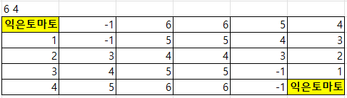 익은토마토에서 출발해도 0,0 위치에 있는 0 토마토가 -1에 막혀 익을 수 없어 -1을 출력한다.