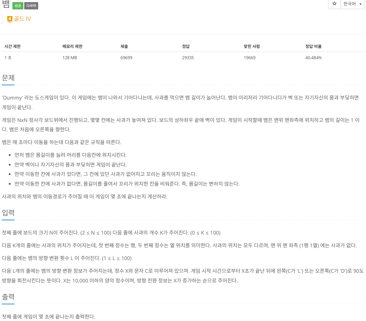 이때 뱀의 머리가 뱀의 몸통에 닿거나 board를 빠저나가면 기록해둔 초를 출력하고 함수를 정지한다. - 뱀저장 배열의 끝에 뱀의 이동할 곳의 좌표를 넣어준다. 이러면 뱀의 머리가 이좌표에 있다는 것이 된다.