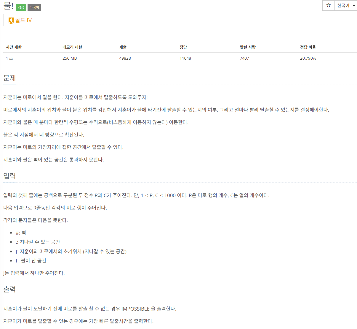 - 문제의 주어진 값들을 다 받는다. 지훈이의 위치를 J배열에 [[y,x]]로 넣어준다. 불의 좌표는 모두 기록해 F배열에 넣어준다.