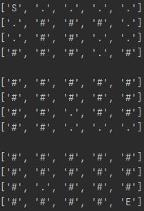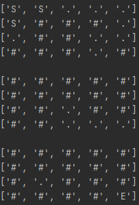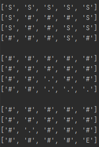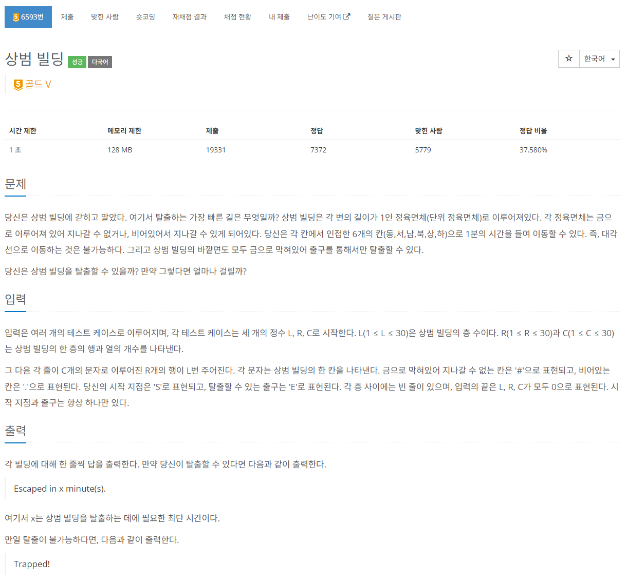 - S 위치들을 저장한 배열을 읽는다. 빌딩에 현제 S를 상하좌우아래위로 움직여 주면서 '.'가 있는곳으로만 움직일수 있으니 '.'가 있으면 [mz,my,mx]를 newS배열에 넣어주고 bilding[mz][my][mx] =='S'로 바꿔서 이동한 곳이라는걸 기록해준다. 만약 이동한 곳이 E라면 탈출한거니 출력해준다.