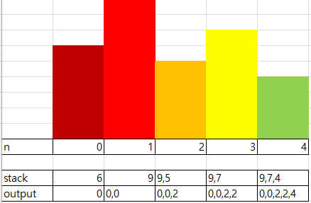 - n= 1 stack[-1]의 6보다 현제 타워의 크기가 더 크니까 stack을 9로 바꾸고 output에도 0을 넣어준다.