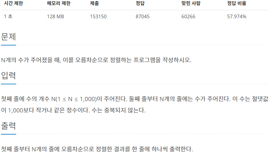 간단하게 N개의 수를 리스트로 받아와서 오름차순으로 sort하면 되는 문제이다.