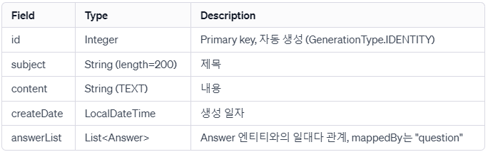 - @Column: 엔티티 클래스의 필드를 데이터베이스 테이블의 컬럼에 매핑하는 어노테이션.