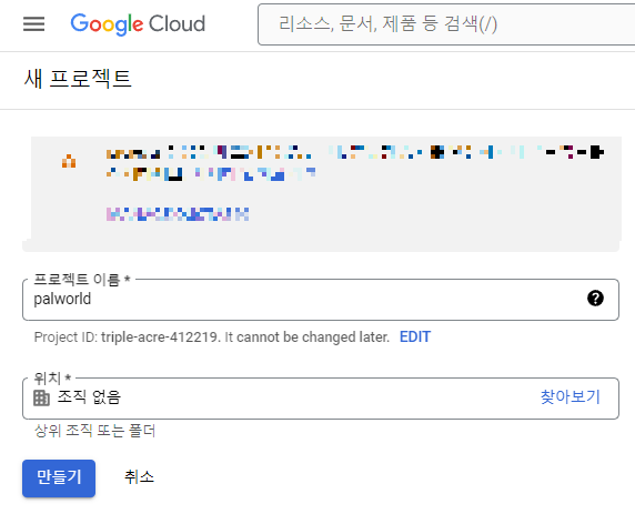 구글 클라우드에 로그인하고 새프로젝트 만들기를 누른다.
