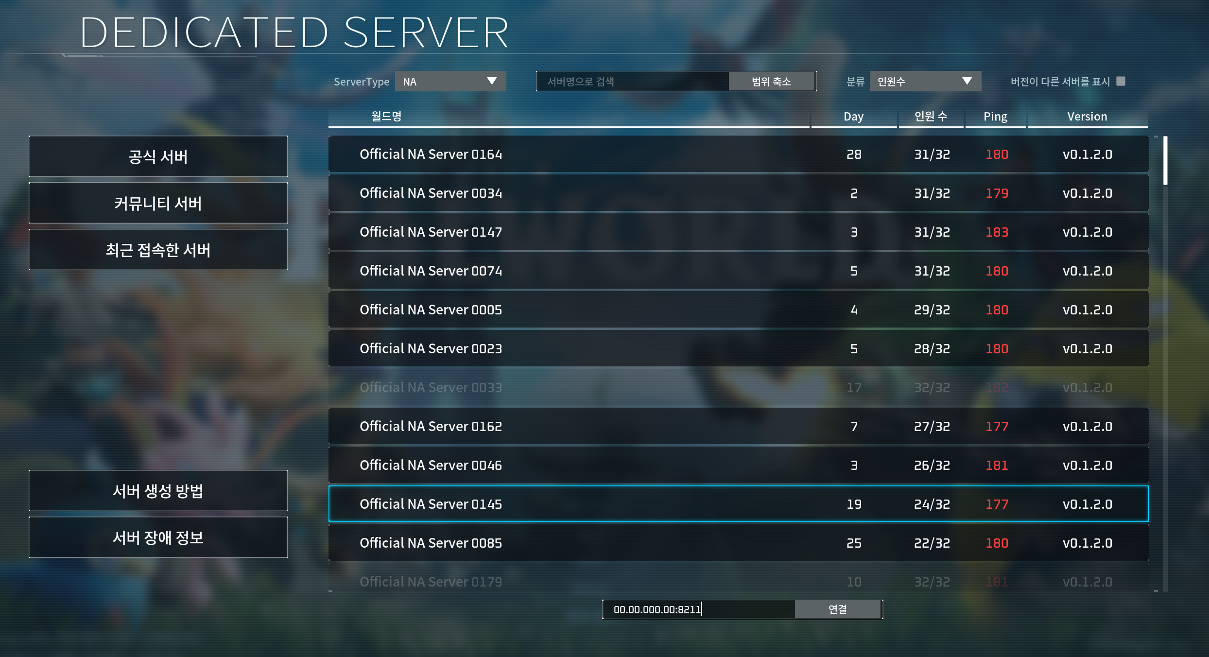 멀티서버로 참가하기 누른뒤에 00.00.000.00:8211로 들어가면된다.
