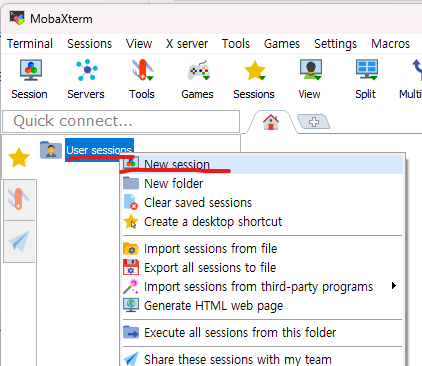MobaXterm으로 다시 올아와서 User sessions에 마우스 오른쪽 버튼,