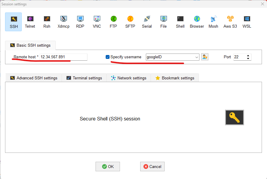 외부 IP를 복사해서 Remote host에 붙여 넣는다.