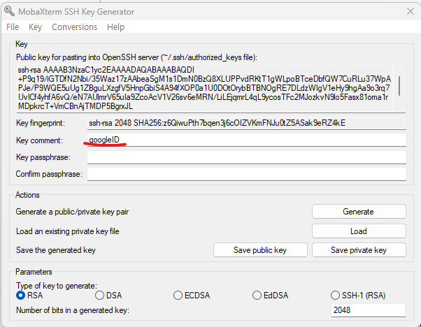 이렇게 key가 생성되면 Key comment부분에 자신의 구글 ID를 넣어준다.