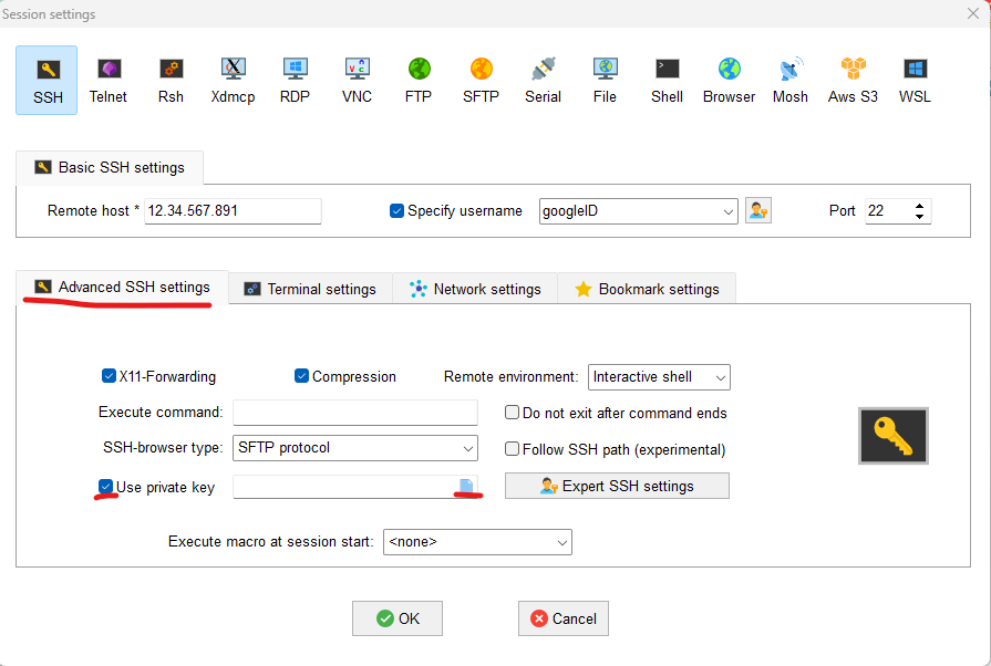Advanced SSH settings를 클릭한후 Use private key를 체크, 밑줄친 부분을 눌러서 아까 만든 private.ppk를 추가한다.