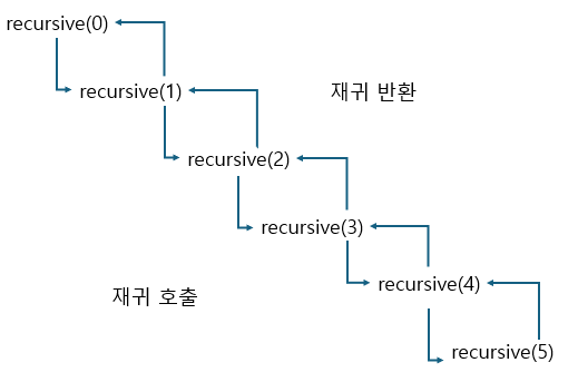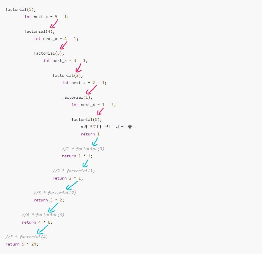 파란색은 값이 재귀 반환되며 값이 이동하는 방향이다.