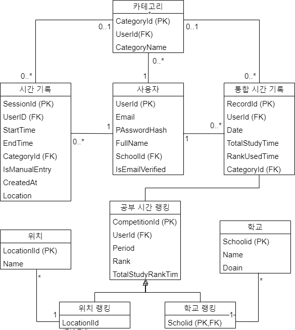 그에 따른 class다이어그램이다. 시간 기록은 공부를 완료했을때의 각각의 시간 기록이고 통합 시간 모델은 날짜당 기록하는 시간 기록이다. 각 클래스의 설명은 github에 설명되어 있다.