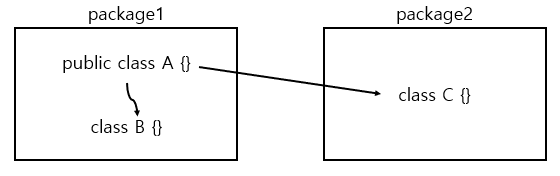 - 같은 패키지에서는 접근 가능하지만, 다른 패키지에서는 접근 불가능
